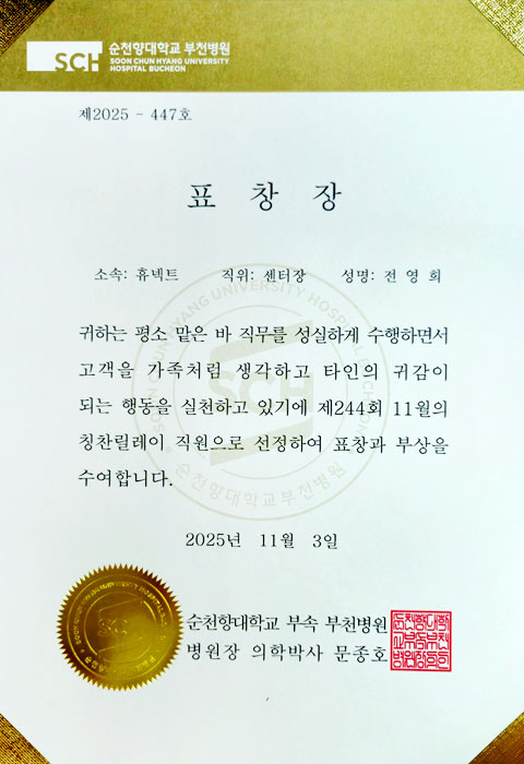 병원장 표창(휴넥트 소속 센터장)